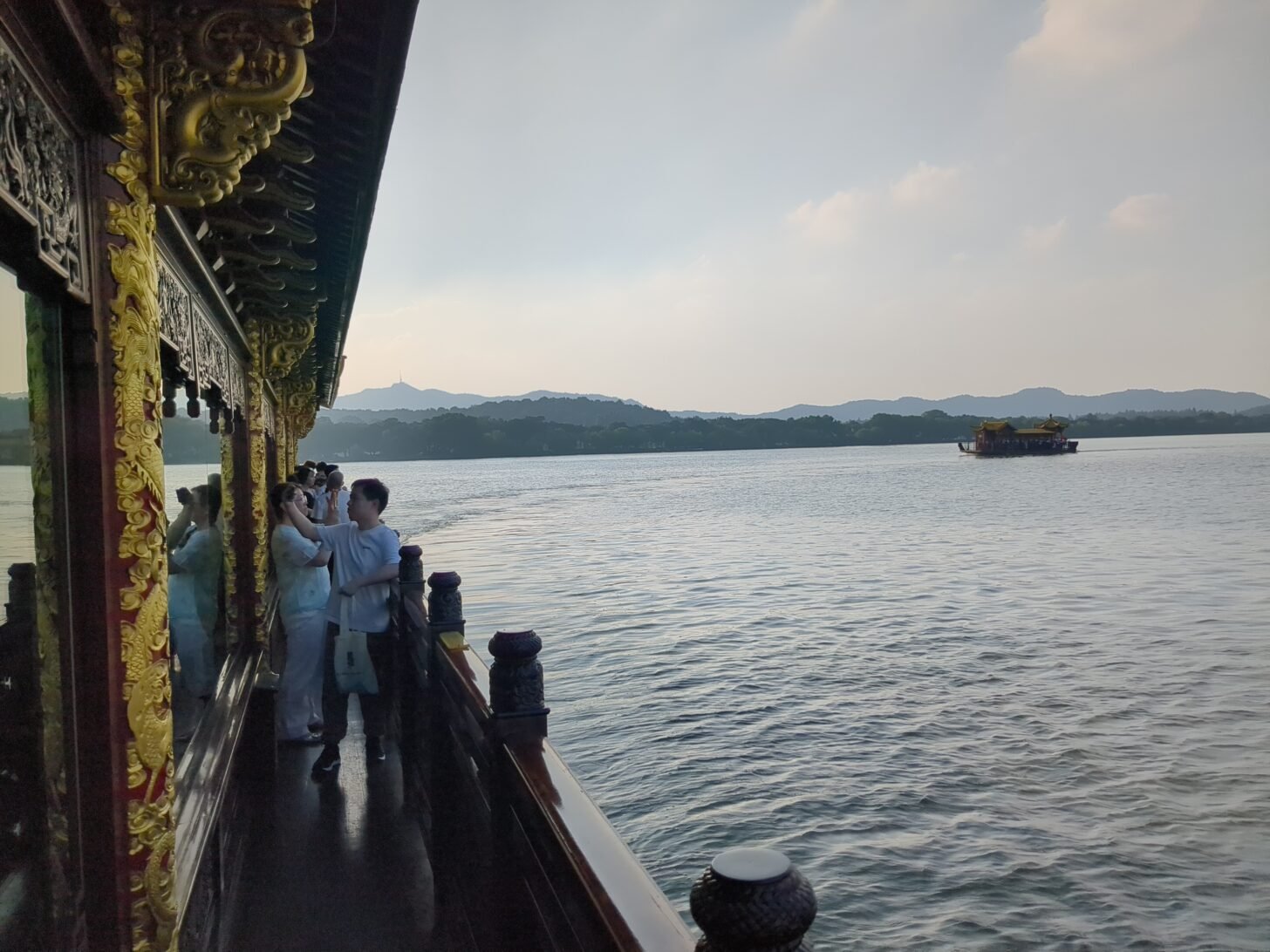 So I got on one of these boats around golden hour just as the sun was setting and everything looks really gorgeous and we went all around the lake and it’s so beautiful. Like I will put some pictures on the transcript. I’ve put some pictures on Instagram, but I really recommend, if you can, if you go to Hangzhou yourself, because it’s truly just gobsmackingly beautiful. It’s so lovely, especially at that time of day.