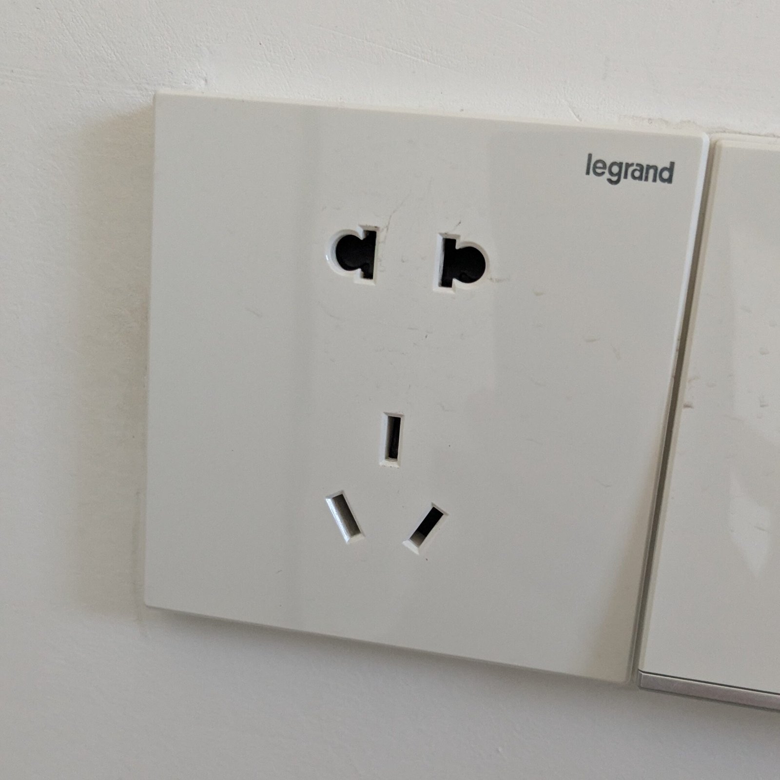 So one thing is the plug situation here. So China has like two types of plug sockets, I think technically three. All of the plug sockets in China, more or less, have two holes. They have like a hole for the two-pronged one and a hole for the three-pronged one, and sometimes they’re kind of like all close together. So you have like five holes all together. I’ll add some pictures to the transcript to make this clearer.