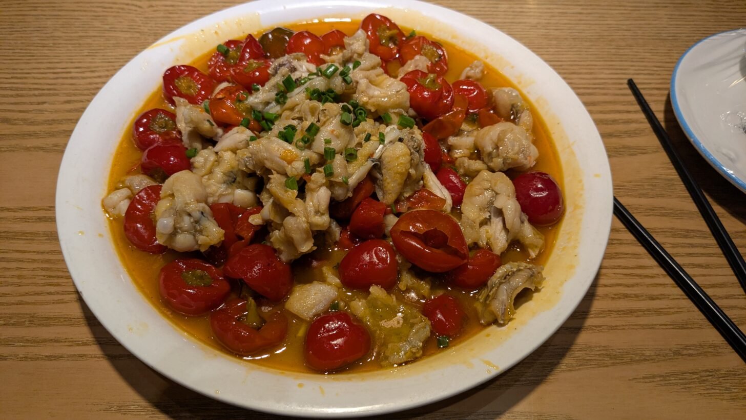 My first few days I tried to be kind of adventurous with food. There was a restaurant next to the hotel that had this really cute frog mascot and I was like, oh, that looks fun. So I looked at the signs outside and I saw something that looked like fried eggs and tomatoes, which I know is a Chinese dish. So I was like, oh, great, I’ll go get that. And I went inside, I ordered, and when it arrived I realised this is definitely not fried eggs and tomatoes. In fact, it was spicy bullfrog soup.
