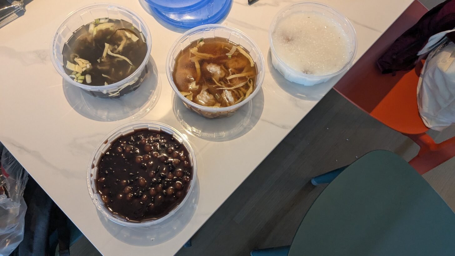Actually, I ordered breakfast delivery today, which is something I would absolutely never do in the UK, but here it’s very affordable and I think it’s more common. And I got some breakfast foods delivered. I had bone broth congee, so rice porridge with um, I guess pork bones in it, and it was so yummy. The flavour of the bone broth really paired well with the porridge. I also had some dumplings and soup that were really nice, this kind of seaweed soup thing that was okay, but I didn’t love, and then I also got some red adzuki bean soup, which was delicious. I mean, it’s kind of like a dessert, but, uh, this was all way too much for one person. Like one of these dishes would’ve been enough for me, and I had four. So I put them to the side, and I guess I’ll have them after recording this podcast for my lunch. Yum, yum, yum.