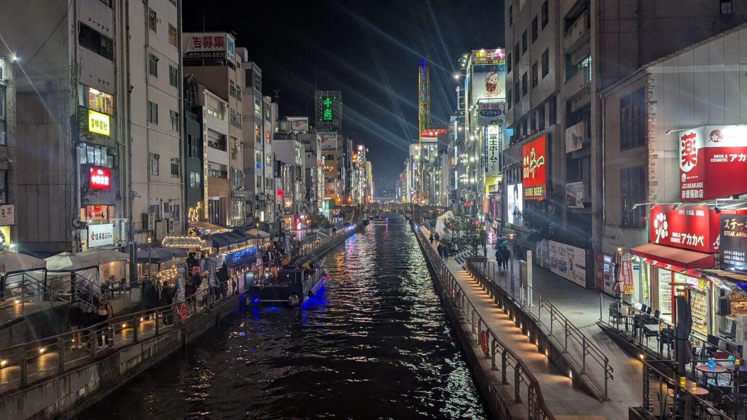 But I checked into my hotel, I went and got dinner at just like a local little cheap buffet-style eatery, and I started to kind of shift into Osaka mode. So there’s this big street in Osaka called Dōtonbori. It’s like a massive street full of neon lights and, uh, food stalls and shops and nightclubs. And it’s like the place to go in Osaka when you’re a tourist because you can kind of experience that rush of like, oh my God, like the big city.