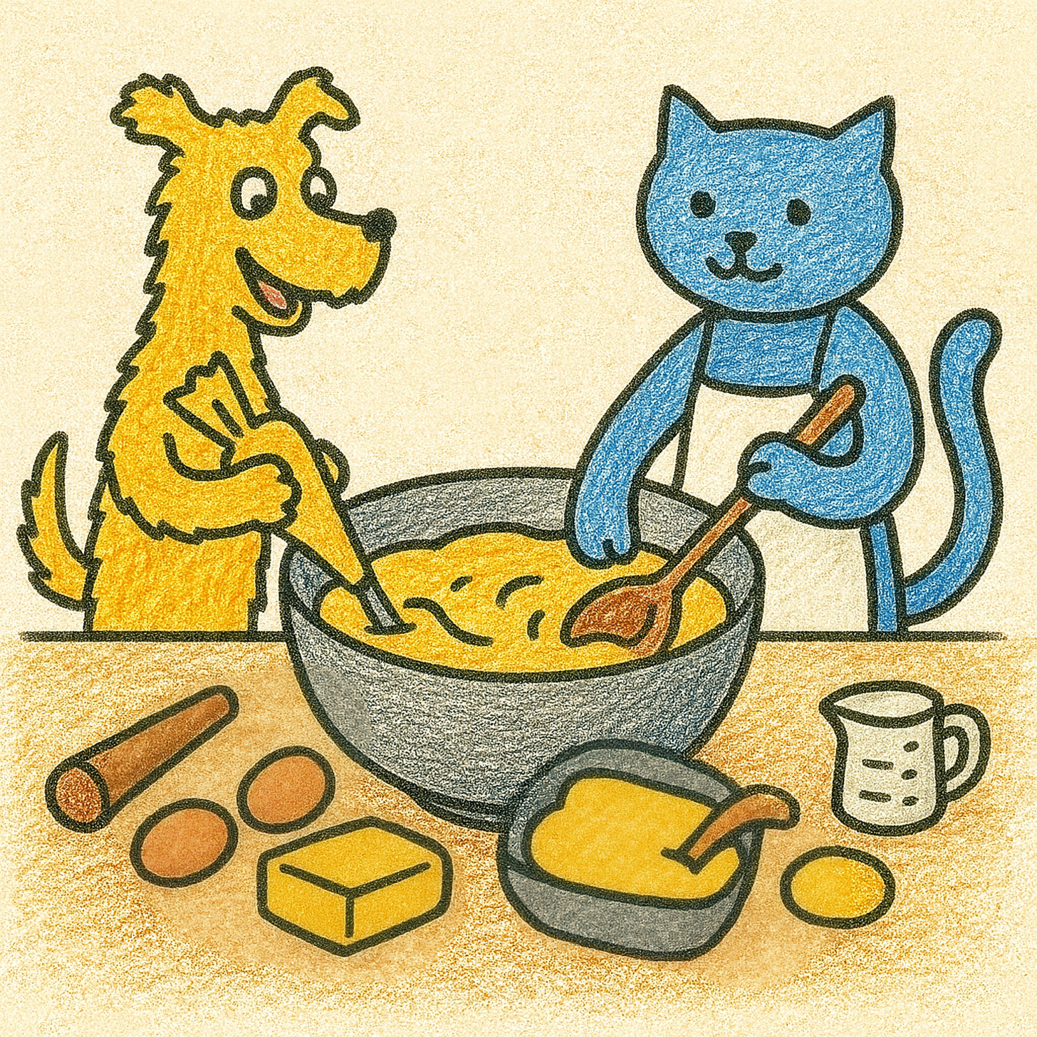 So Doggo and Kitty took out their cake tin and got to cooking.